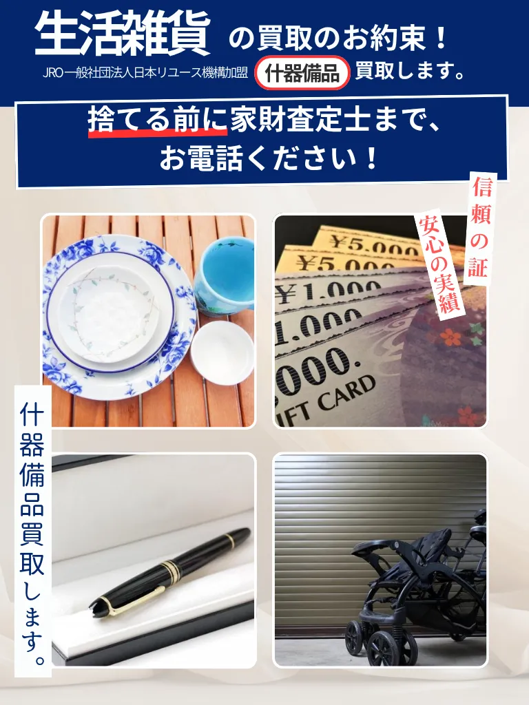 ブランド食器から贈答品、ベビー用品まで、あらゆるジャンルの生活雑貨・日用品の買取で豊富な経験と実績があります。
