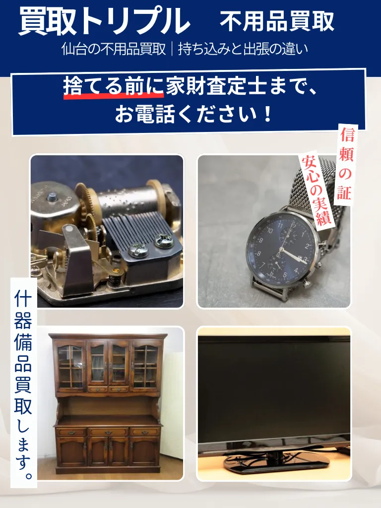 仙台市内・近郊であれば、最短でご連絡いただいた当日の見積もり・回収も可能です。「明日退去立ち合いがある」といったお急ぎの案件も、まずはご相談ください。