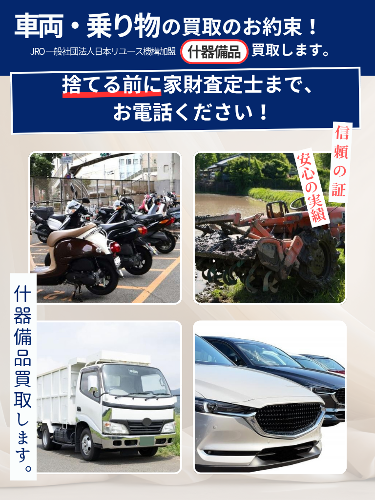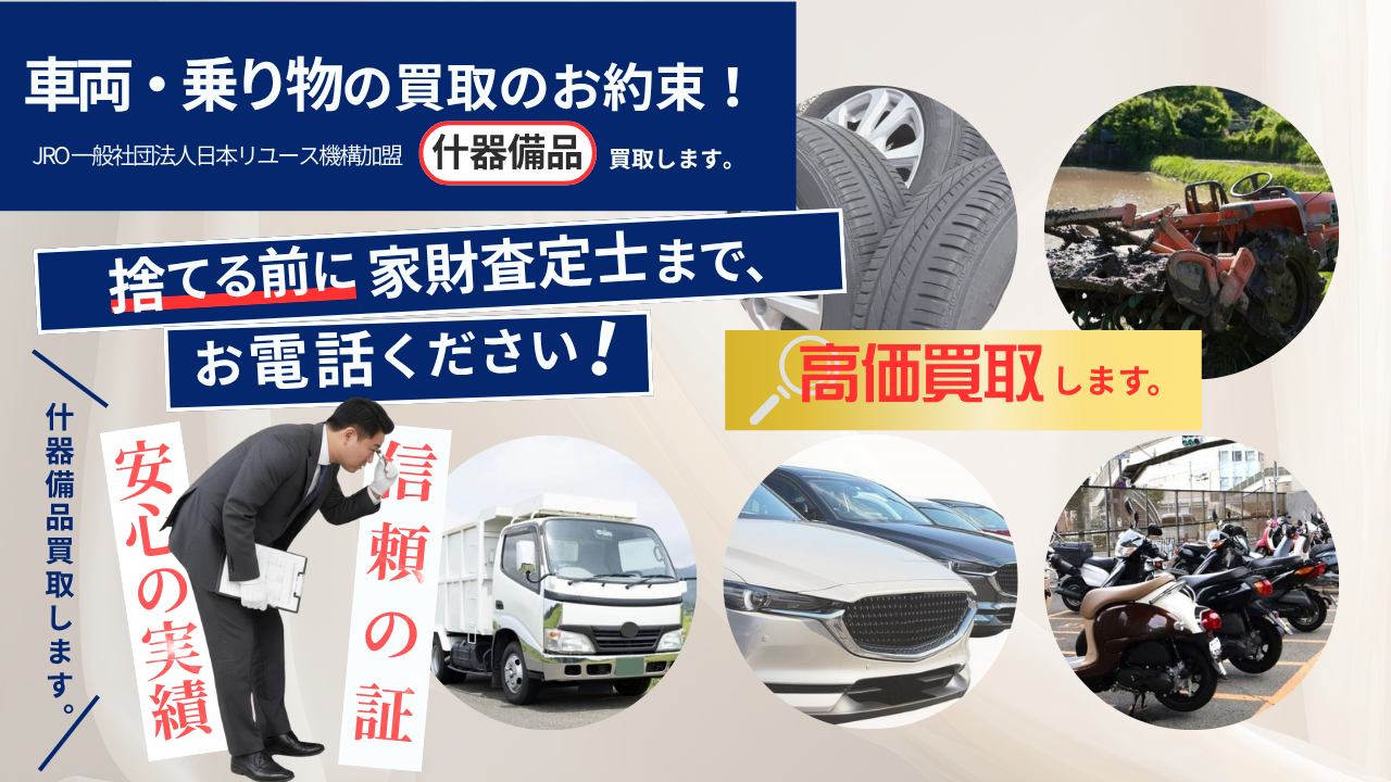 車両の買取だけでなく、車庫や物置の不用品回収、遺品整理、お部屋の片付けまで、ワンストップで対応可能です。